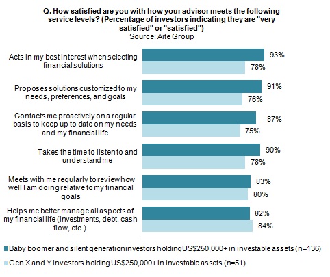 In 5 of the 6 categories, the Gen X/Y investor is notably LESS satisfied with their advisor than the Baby Boomer investor.