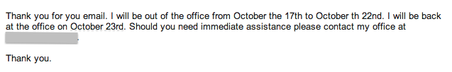 Spin: “I’ll respond when I return on November 3rd.”