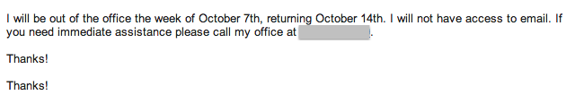 Tell them the day AFTER you return – It’s all about managing expectations with this one. The chance that you’ll reply to everyone on the day you get back is slim. If you’re set to return on the 2nd, say you’ll be back on the 3rd. Give yourself a full day to sift through your bank of emails and begin to reply. Plus, even if they’re one of the few emails you respond to on the 2nd, they’ll feel special for receiving early assistance. Awesome.