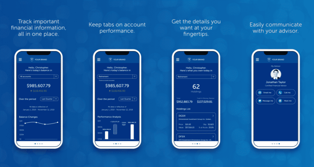 The entire experience makes advisor engagement easy and fosters a more convenient connection between you and your clients. You don’t have to be a technical wizard to make the app play nice, either. The advisor settings are simple and smart (with impressive defaults) while still keeping you in the driver’s seat. Clients can easily reach out to you in a variety of ways, both directly from the app and from their mobile devices.